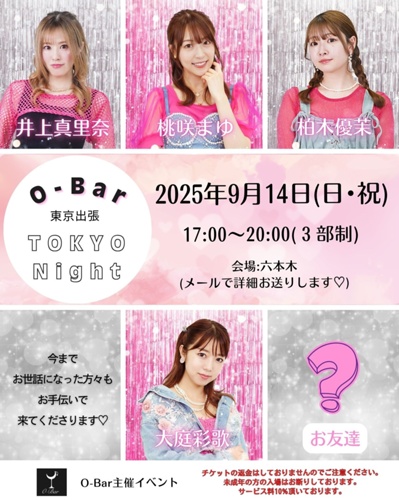 O-Bar東京出張\TOKYO Night/日時2025年9月14日(日・祝)17:00〜20:00(3部制)場所六本木(✉️でお知らせします♡)チケット¥11,000(飲み放題付) ※購入の際にお目当てのメンバーを書いてください http://tiget.net/events/420434 販売スタ...