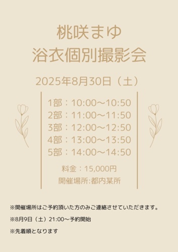 桃咲まゆ「浴衣個別撮影会」 日時2025年8月30日(土) 1部:10:00-10:50 2部:11:00-11:50 3部:12:00-12:50 4部:13:00-13:50 5部:14:00-14:50料金15,000円開催場所都内某所 ※ご予約いただいた方のみにご連絡させていただきます。販売サイトht...