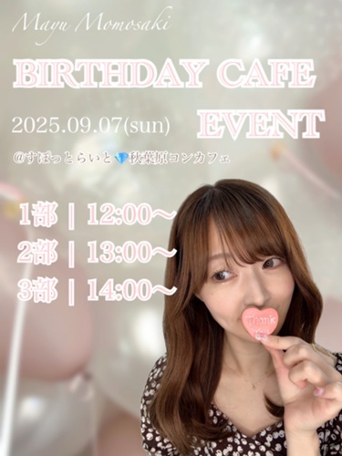 桃咲まゆ「BIRTHDAY CAFE EVENT」日時2025年9月7日(日) 1部:12:00〜 2部:13:00〜 3部:14:00〜会場すぽっとらいと💎秋葉原コンカフェ 〒101-0021 東京都千代田区外神田1丁目6−3 アキバあそび館ビル 7F 金額11,000円販売サイトhttps:/...