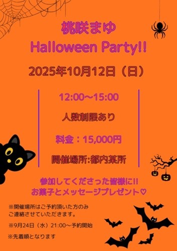 桃咲まゆ「Halloween Party‼︎」日時2025年10月12日(日)12:00〜15:00場所都内某所 ※参加者のみにご連絡致します料金15,000円(お菓子とメッセージのプレゼント有り)予約フォームhttps://www.quartet-online.net/ticket/halloween202...