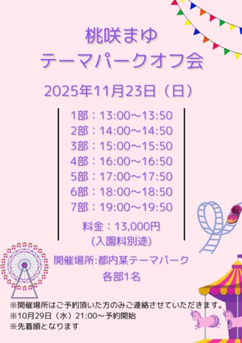 桃咲まゆ「テーマパークオフ会」日時2025年11月23日(日)13:00〜20:00 7部制/各部50分間/各部1名場所都内某テーマパーク (ご予約いただいた方のみご連絡させていただきます。)参加費13,000円 ※別途入園料が必要となります予約フォームhttps://www.quartet-online.n...